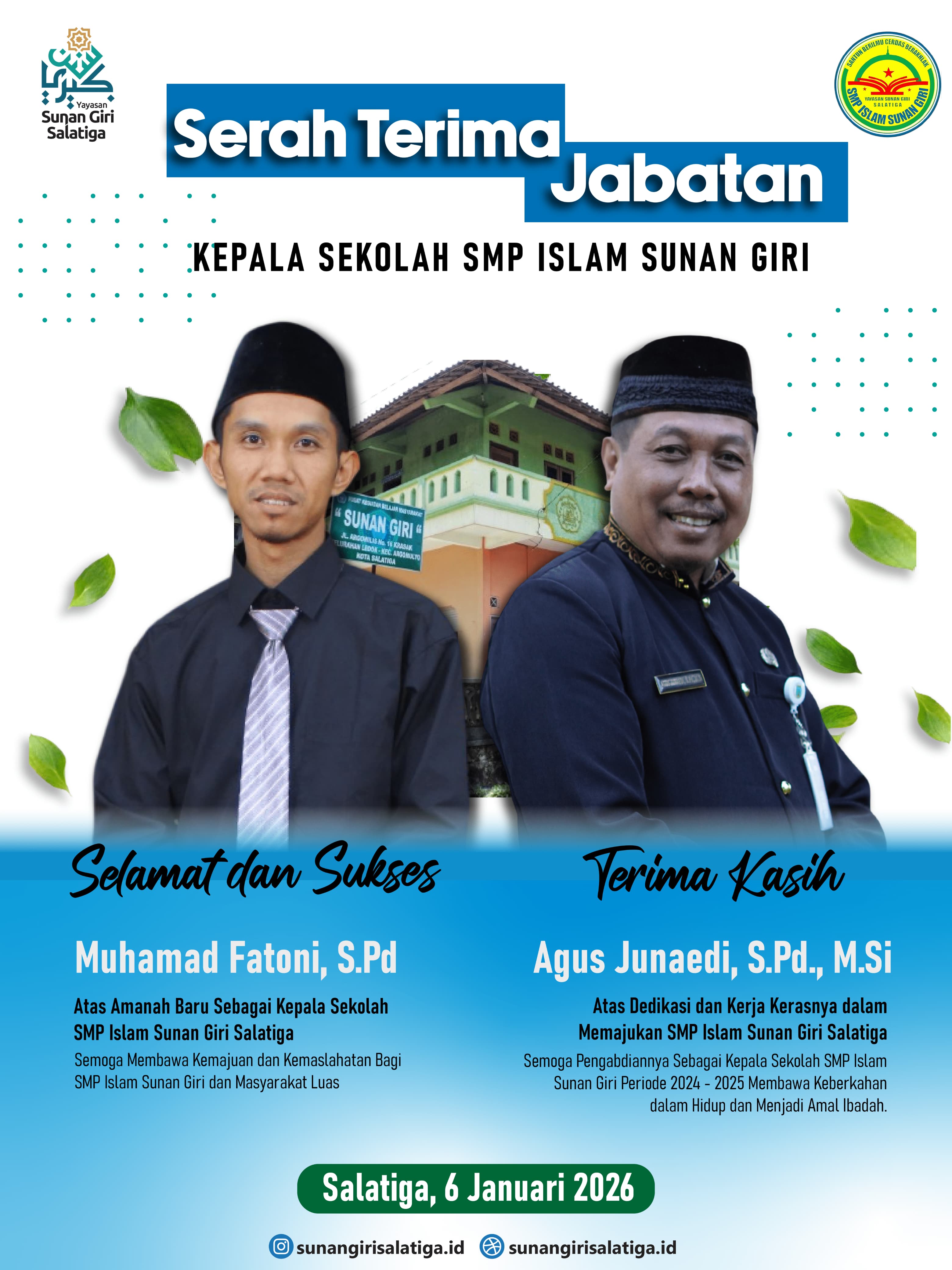 Salatiga, 6 Januari 2026 — SMP Islam Sunan Giri Salatiga melaksanakan kegiatan Serah Terima Jabatan (Sertijab) Kepala Sekolah sebagai bentuk pergantian amanah kepemimpinan yang berlangsung dengan khidmat dan penuh rasa syukur.
